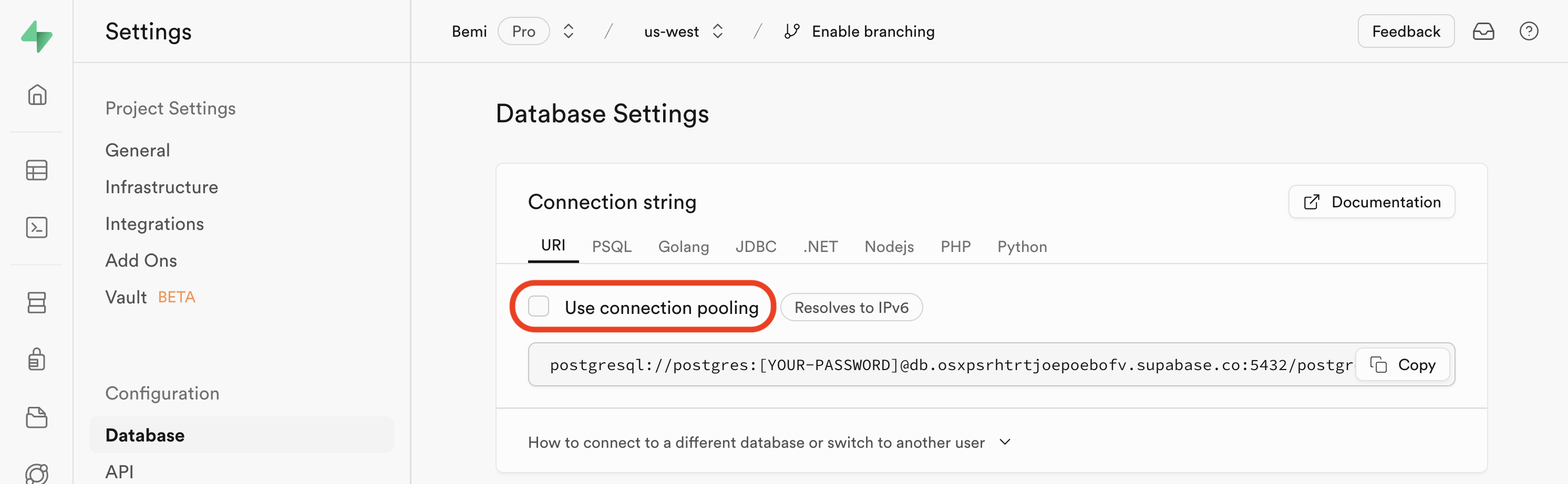 To connect a Supabase database, you need to go to your Supabase project settings, untoggle "Use connection pooling", and use these connection details on Bemi to connect to the replication log.